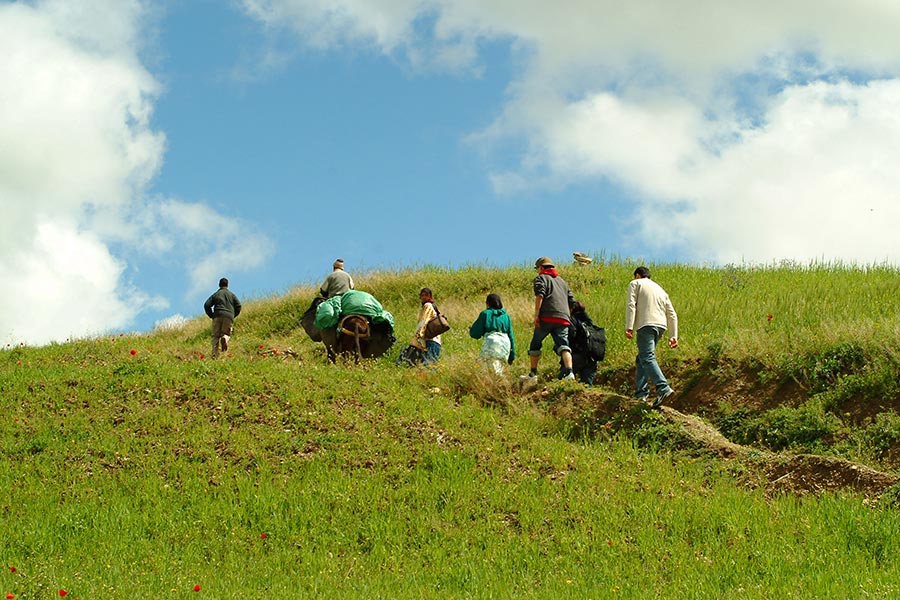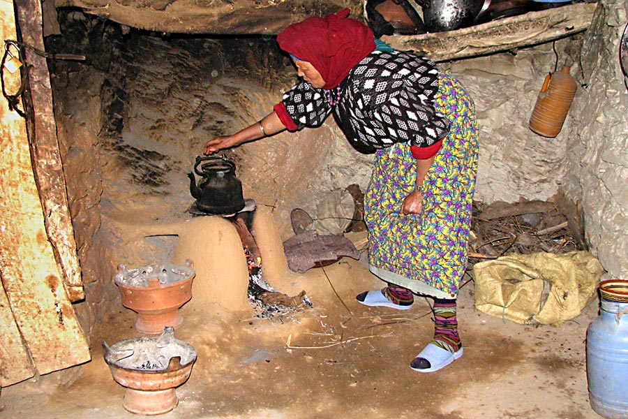 Depois de chegar a Amizmiz, nosso ponto de partida, viajaremos como fazem os locais: a pé ou, para quem precisar, de burro. Isso proporciona muito tempo para perguntas e discussões com o seu guia, que fará todo o possível para garantir que você saia com uma boa compreensão da vida na aldeia berbere. Caminhar também lhe dá a oportunidade de observar pequenos detalhes—uma flor silvestre, como as casas berberes são construídas, certas formações rochosas—que de outra forma seriam perdidos para alguém que viajasse de carro. Depois de passar por trilhas e trilhas locais, iremos até uma casa berbere para tomar chá ou almoçar. Comeremos com as próprias famílias e, nas excursões noturnas, você será incentivado a assistir, ou até mesmo ajudar, no preparo das refeições. Enquanto saboreia as refeições e o chá, você pode ficar à vontade para conversar com seus anfitriões e fazer mais perguntas a eles ou ao guia. Dependendo da excursão, poderá haver tempo para explorar mais a aldeia, ver a agricultura local ou explorar importantes fontes de água próximas, como riachos, canais de irrigação ou nascentes. Você terá muitas oportunidades de pausa enquanto caminha e também muitas interações espontâneas nas trilhas com moradores locais que provavelmente conhecerão nossos guias e iniciarão conversas improvisadas. Eventualmente, você retornará a Amizmiz por um conjunto de trilhas diferentes daquelas que percorreu inicialmente.