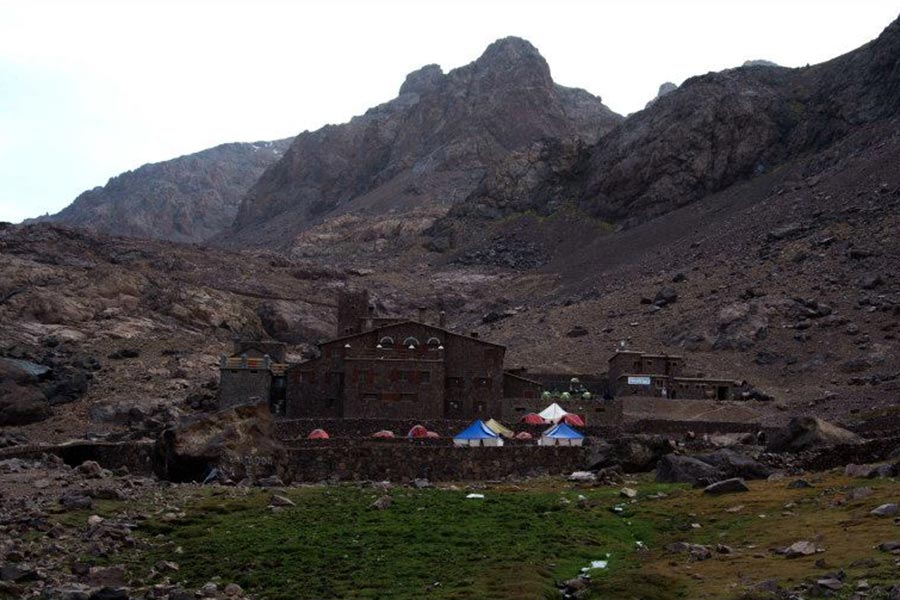 | Dia 1: | Marrakech > Imlil > Refúgio Viagem de Marrakech para Imlil (alt. 1740m). Aqui encontramos nossos mulas e embalamos nossos suprimentos (bolsas, água e comida) para três dias. Início da caminhada, após 3 horas de caminhada paramos para almoçar em Chamharouch. Continue a caminhada por mais 2-3 horas, chegando ao refúgio (alt. 3200m) para jantar e pernoite. |