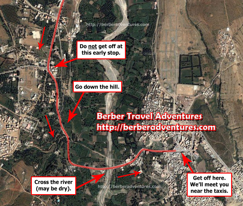 Esta é a opção mais barata das três (11 DH por pessoa em cada sentido), mas também o mais complicado. Por favor, considere esta opção apenas se você estiver bom com orientações e hábil no uso de transporte público. Envolve três etapas: 1) encontrar ponto de ônibus, 2) pegar o ônibus correto e 3) descer no ponto de ônibus localização certa em Amizmiz.