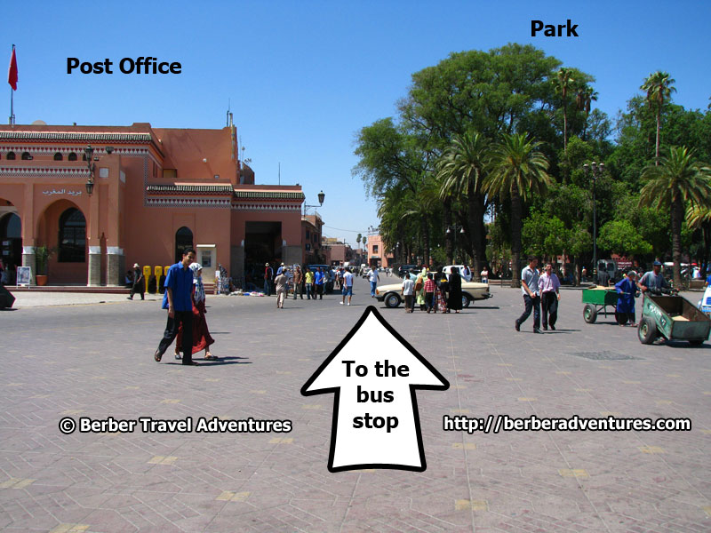 Se você vem de Djemaa el Fna, clique aqui para ver uma foto mostrando o caminho que você deseja pegue, entre os correios (esquerda) e o pequeno parque (à direita). O mesmo parque é visível no mapa acima como um área triangular com árvores verde-escuras.