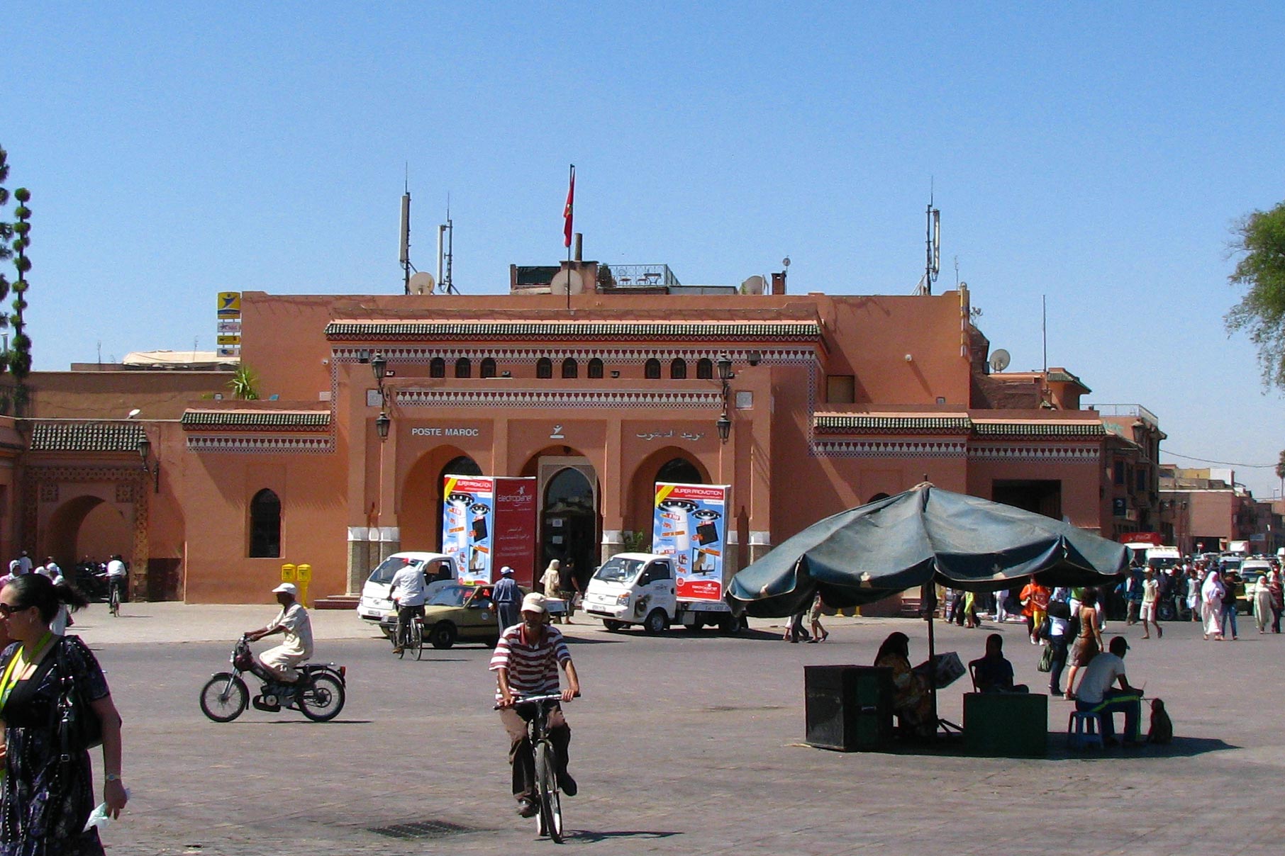 o táxi em frente ao prédio dos correios Djemaa el Fna, marcado “POSTE MAROC”, que fica diretamente